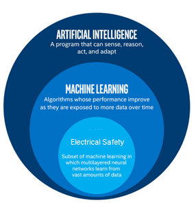 AI/ML models learn from past data to identify patterns and relationships between variables. They then use these learned patterns to forecast future trends, make predictions, and make informed decisions. Machine learning can be either supervised where a target variable is utilized or unsupervised in which there is not a specified target variable. Additionally, these models are valuable tools that can be used in a wide range of applications to gain valuable insights from data and make more informed decisions. As the figure below illustrates, machine learning and electrical safety are subsets of artificial intelligence.