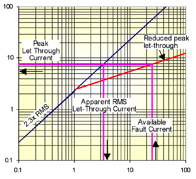 The figure above illustrates and compares the Peak Let-Through Current (RMS) of traditional fuses compared to electronic or smart IEFs shown with the red line with reduced fault current.